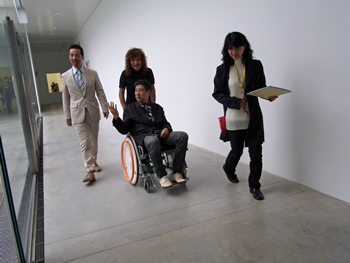川崎和男さんデザインの車椅子に乗る横尾、担当学芸員平林恵氏